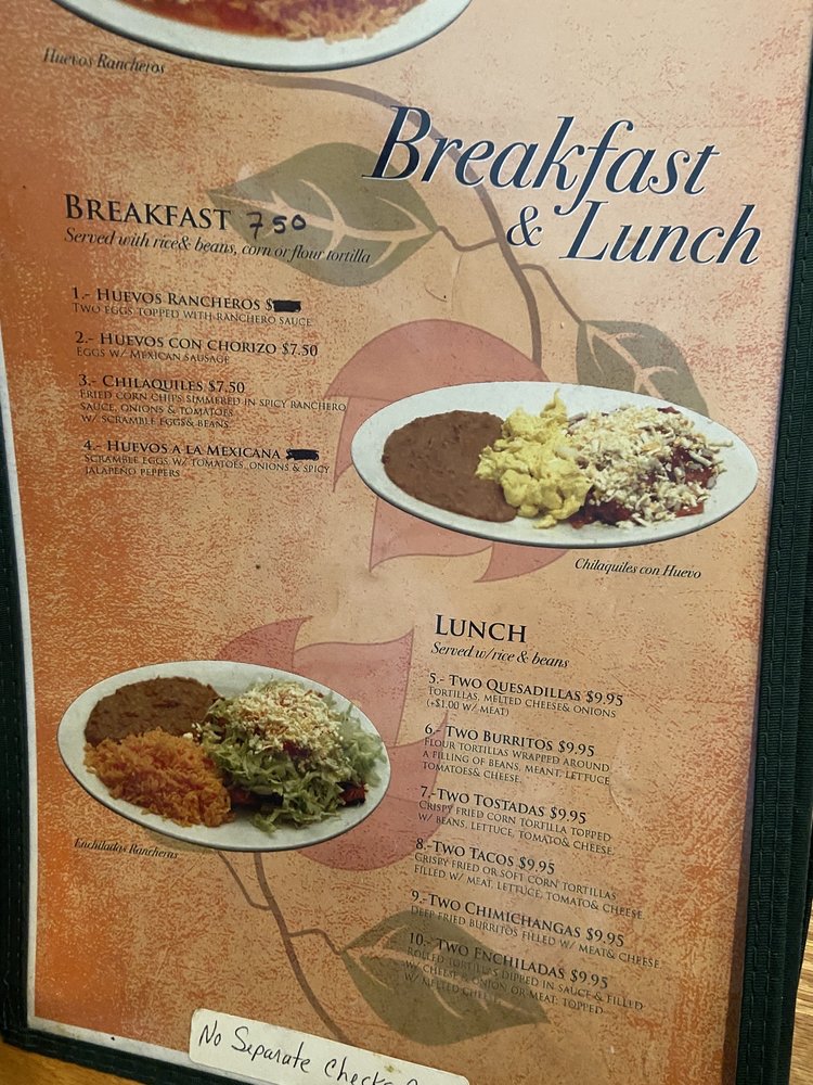 Fried corn chips in spicy ranchero sauce, onions and tomatoes, with scramble eggs and beans.